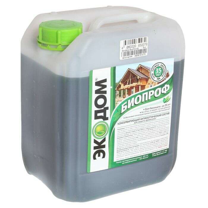 Антисептический консервирующий состав для защиты древесины фисташковый Экодом Биопроф 5кг. Назначение:Защита древесины, находящейся в тяжелых условиях эксплуатации (I-ХIII классы условий службы по ГОСТ 20022.2) от биопоражений (гниения, плесени, грибка, синевы)Область применения:Применяется внутри и снаружи помещений:по новым или старым (неокрашенным или очищенным от старого покрытия) деревянным поверхностям (нижние венцы дома, половые лаги, подполы, подвалы и др.), в том числе имеющим прямой контакт с влажным грунтомпо материалам на основе древесины (ДВП, ДСП, MDF, клееный брус, фанера и др.). СВОЙСТВА: содержит невымываемый антисептик, химически связывается с древесинойпредотвращает появление, останавливает развитие и уничтожает биопоражения, не препятствует дальнейшей обработке древесины любыми ЛКМ, глубоко проникает в структуру древесины. Не препятствует дыханию древесины, не ухудшает прочность и склеиваемость древесины, не скрывает природный рисунок древесины, окрашивает древесину в зеленовато-фисташковый оттенок. Не содержит органических растворителей, не имеет ярко-выраженного неприятного запаха, обладает низкой коррозионной активностью (не вызывает коррозии металлических элементов крепежа). Расходпри нанесении кистью, валиком, распылителем: 250-300г/м2, при нанесении методом глубокой пропитки – 200-240 кг/м3. *пропитка для дерева, пропитка старой древесины, пропитка древесины, консервация дерева, огнезащита древесины, биозащита древесины, древесный антисептик, красный антисептик, фисташковый антисептик. защита от гниения дерева*