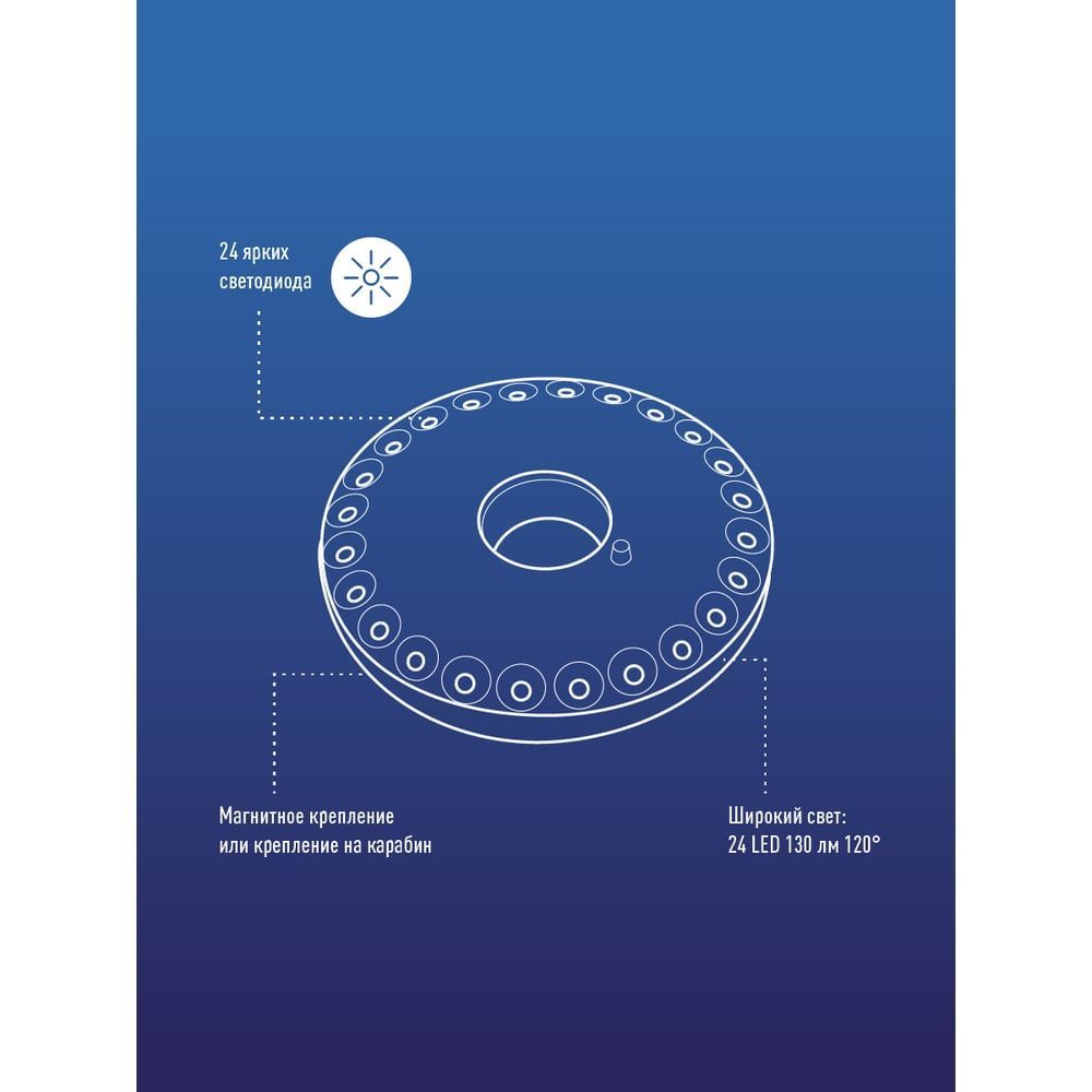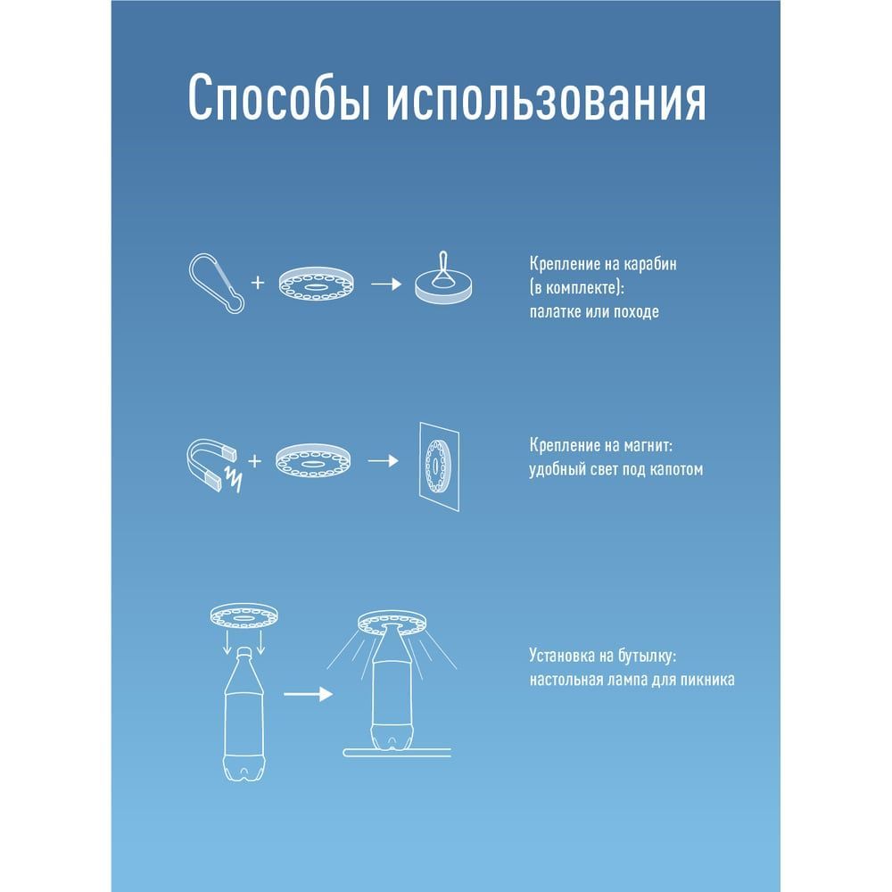 Походный фонарь-светильник в виде диска – удобный свет для палатки. На корпусе расположены магнит и специальный карабин для подвешивания. Широкий свет – освещает широкое пространство с одной стороны, удобен для работы вблизи. Площадь освещения светильника - 15 кв.м, время беспрерывной работы – до 8 ч. Работает от 3 батареек АА. Упакован в коробку с подробной информацией о модели и схемой фонаря.