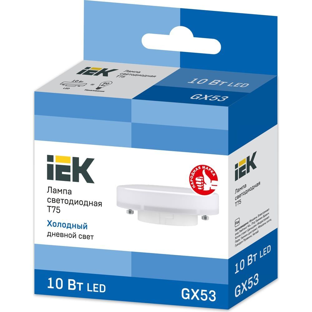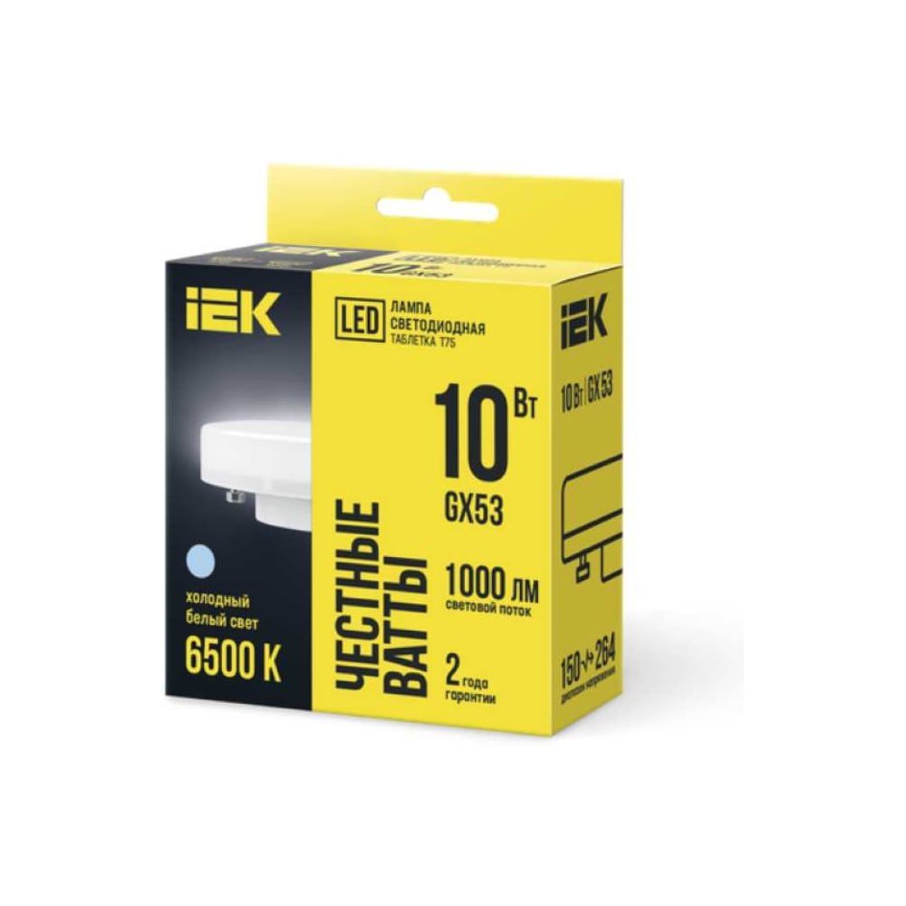 Лампа LED T75 таблетка 10Вт 230В 6500К GX53 IEK. Светодиодные лампы предназначены для использования в осветительных приборах наружного и внутреннего освещения объектов промышленного, коммерческого и бытового назначения. Соответствуют требованиям Технических регламентов Таможенного союза ТР ТС 004/2011, ТР ТС 020/2011, МЭК 62560, Постановления Правительства РФ от 10.11.2017 № 1356.