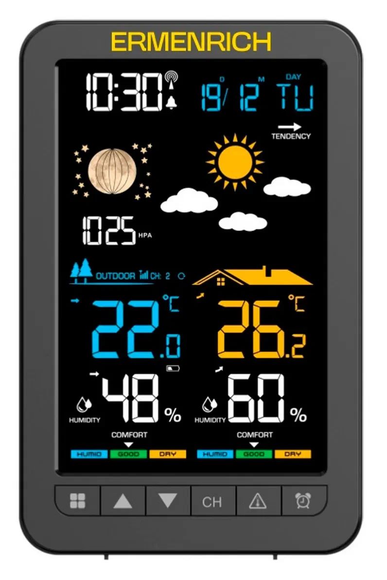 Благодаря сочетанию точных измерений температуры, влажности и давления, наглядного цветного дисплея, прогноза погоды, индикации комфорта, отображения фазы Луны и базовых функций часов с будильником метеостанция Ermenrich Report WR30 становится универсальным домашним помощником для тех, кто хочет всегда иметь под рукой актуальную и наглядную картину погоды и состояния микроклимата.
