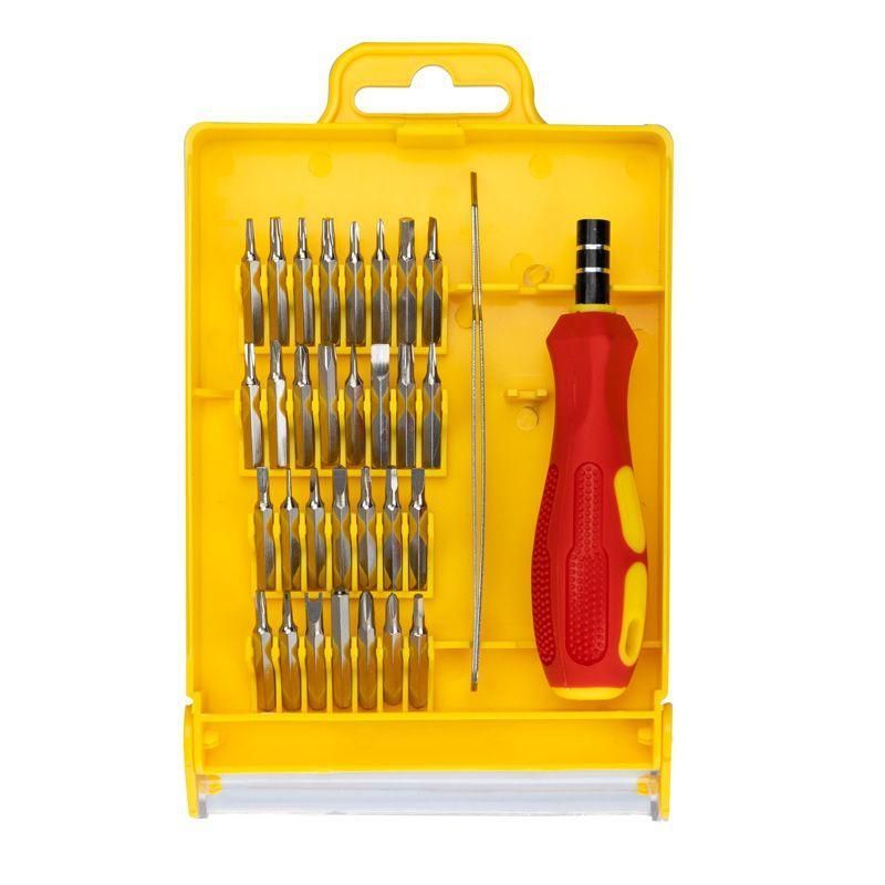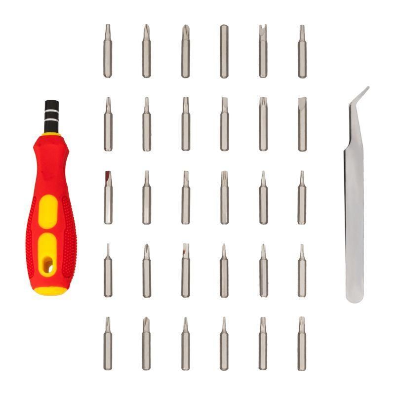 Набор отверток для точечных работ арт.12-4701 REXANT 32 предмета предназначен для выполнения прецизионных работ в электронике и электромеханике. Биты набора выполнены из хромованадиевой стали. Эргономичная двухкомпонентная рукоятка отвертки делает работу с инструментом легкой и удобной. Магнитный держатель обеспечивает быструю замену и надежную фиксацию насадок. Набор поставляется в пластиковом боксе и содержит 32 предмета: Отвертка 1 шт. Биты 30 шт. (H 1.5, H 2.0, H 2.5, H 3.0, H 3.5, H 4.0, SL1.0, SL1.3, SL1.5, SL 2.0, SL 2.5, SL3.0, SL4.0, PHOOO, PHOO, PH0, PH1, PH2, ^3.0, Y3.0, U2.6 , ?2.0, Т 3,Т4, T5, T6, T7, T8, T10, Т15). Пинцет 1 шт.