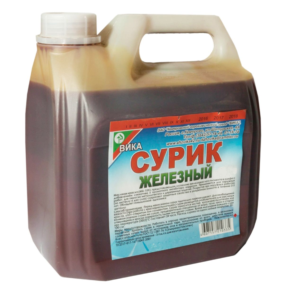 Сурик железный - представляет собой суспензию железоокисного пигмента в олифе с добавлением сиккатива, хроматного ингибитора коррозии и тиксотропирующих добавок, препятствующих образованию осадка. Краска (эмаль) сурик железный изготовлен на основе неорганического пигмента (оксида железа), который придает краске кирпично-красный цвет. Сурик применяется при строительстве и ремонте для окраски металлических поверхностей (крыш, трубопроводов, гаражей и т.д.), так как он обладает противокоррозионной стойкостью. Пленка устойчива к воздействию температур от -50С до +60С. Покрытия при наружных работах (по металлу в два слоя) сохраняют защитные свойства в умеренном климате в течение 3-5 лет.