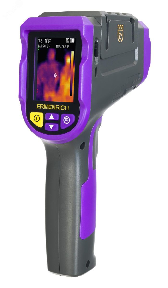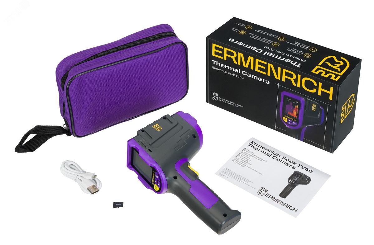 Тепловизор Ermenrich Seek TV50 — это многофункциональный прибор для диагностики тепловых утечек, поиска мест повышенного нагрева, контроля монтажа теплых полов, лабораторных исследований и других задач. Он оснащен инфракрасным сенсором 32x32 пикселей с диапазоном температур от –20 до +400 C и 2-мегапиксельной камерой для вывода изображения на цветной TFT-экран. Тепловизор работает в 4 режимах отображения (ИК-изображение, видимый свет и их совмещение) и поддерживает 7 цветовых палитр. Измерение температуры производится с помощью экранного ''прицела'', показывающего минимальные и максимальные температуры области. Устройство сохраняет фотографии на карту памяти microSD (в комплекте 16 ГБ), работает от аккумулятора с зарядкой через microUSB и имеет функцию автоотключения для экономии энергии. Корпус выполнен из ударопрочного пластика и выдерживает падение с высоты до 1 метра.