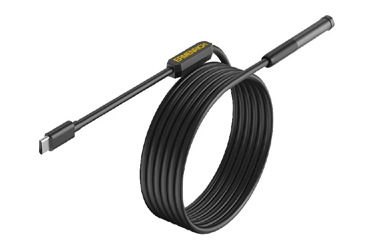Камера защищена по стандарту IP65, а корпус выполнен из прочного ABS-пластика. В комплект входят практичные насадки — магнит, крюк и держатель — расширяющие возможности эндоскопа при работе в труднодоступных местах.
